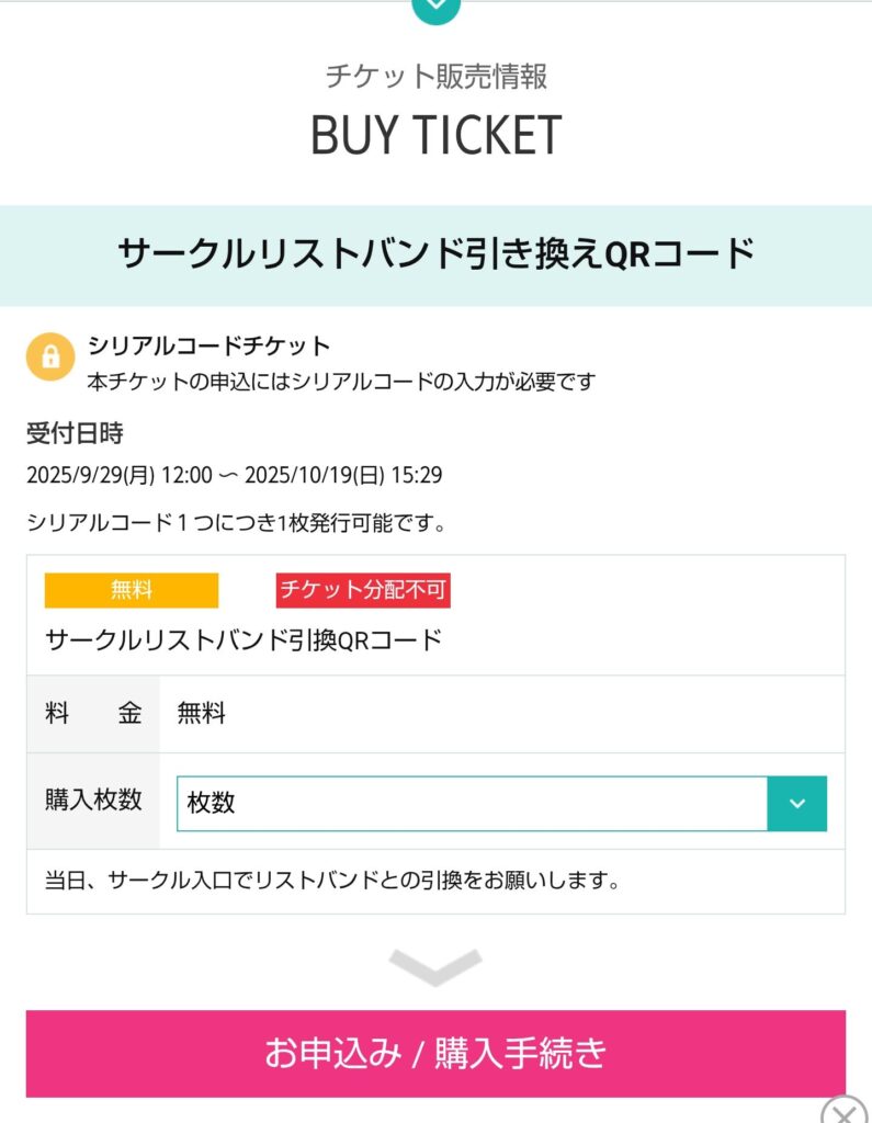 ① 1. LivePocketのURLを使ってページを開いて下にスクロールすると、リストバンド引き換えQRコード、というような項目が出てきます。「購入枚数」は1枚にしてください。